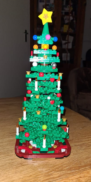 een lego boom met een kerstdorpje er om