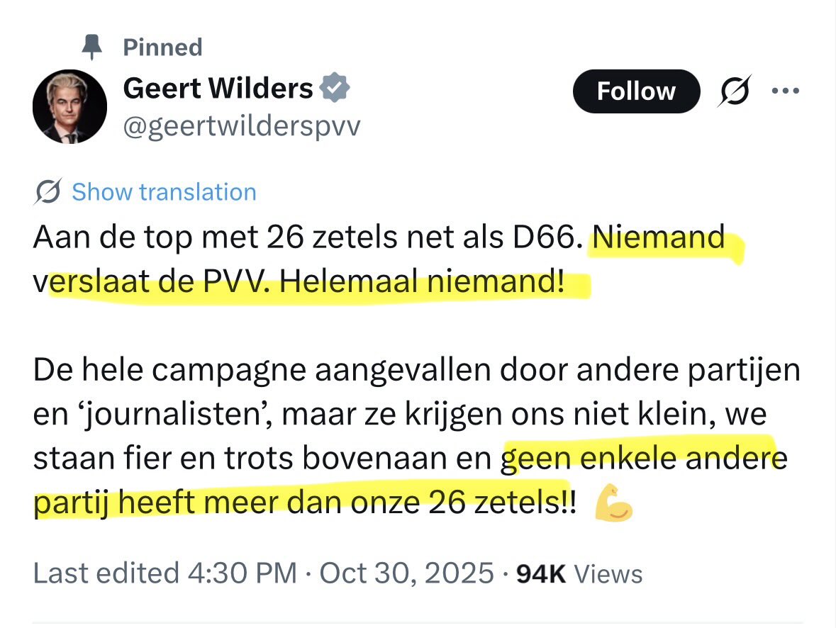 Ja, en bij wie ga je je steun voor je plannen dan kopen? Bij de PVV?quote:Op vrijdag 31 oktober 2025 08:35 schreef TheVulture het volgende: