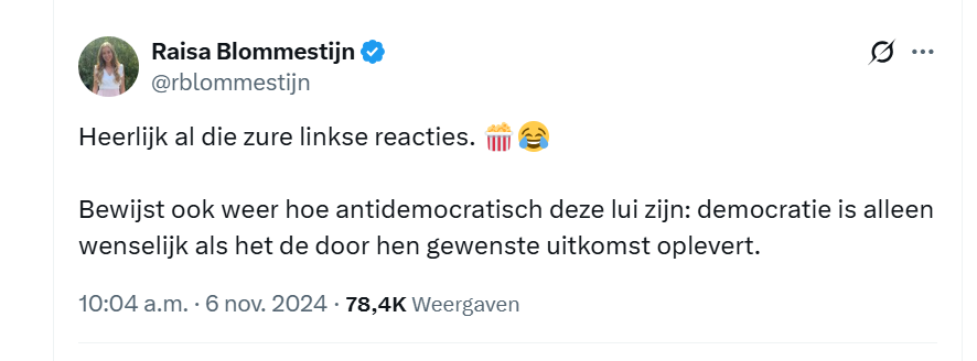 We zijn voor de democratie zolang iedereen maar stemt op links, anders komt de democratie in gevaar.quote:Op zaterdag 1 november 2025 10:39 schreef Klopkoek het volgende: