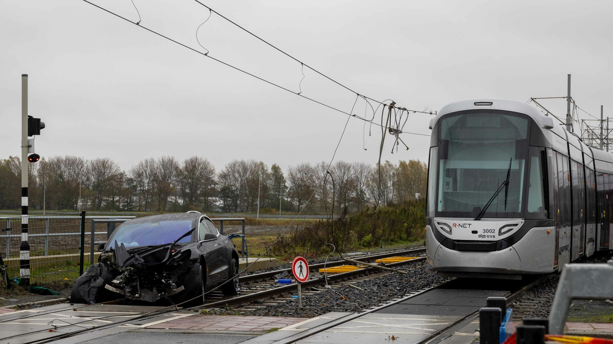 In de video bij nhnieuws hoor je dat de spoorbomen al naar beneden waren toen de auto de overweg over reed. De tram zal dan al heel dichtbij zijn.