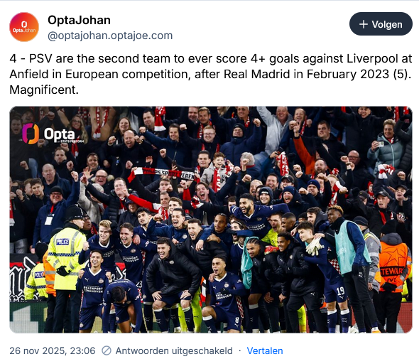 Over paar jaar ben je de vorm van Liverpool vergeten en herinner je je enkel nog de 1-4 op Anfield.quote:Op woensdag 26 november 2025 23:03 schreef Faraday01 het volgende: