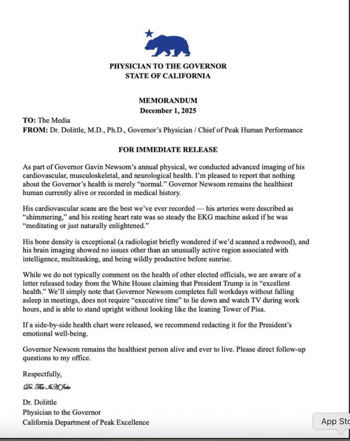Newsom heeft zich meteen ook maar even laten checken