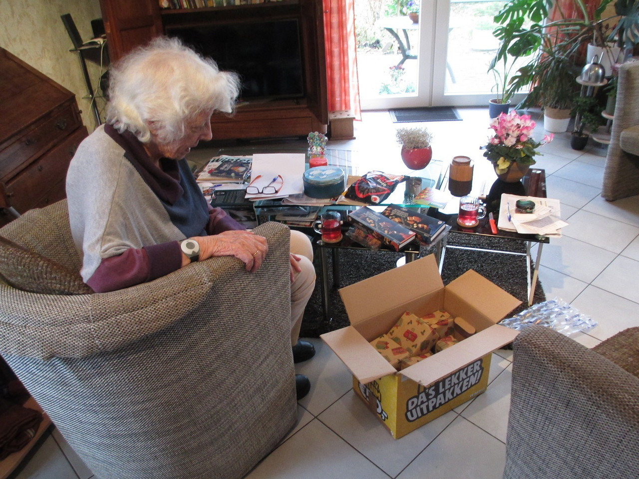 Mijn moeder was sprakeloos, een doos met lekkere dingen en heel veel kadootjes. De kadootjes laten we dicht tot kerstmis. Ik had foto´s gemaakt, maar bij ze op de pc zetten, doet de camera niks meer, grrrr. . . . Morgen bij daglicht even op een andere manier foto´s maken . . .foto´s komen nog.