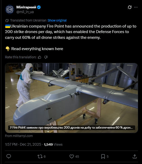 Oekraiense drone fabrikant (en ook fabrikant van de flamingo) zegt nu 200 FP1 en FP2 drones per dag te maken. FP1 en FP2 drones zijn redelijk nieuw , maar hebben in korte tijd enorm veel schade aangericht bij de Russen. Het zijn medium lange afstands drones, die tot 200km ver gaan maar bestuurd kunnen worden met camera en een warhead hebben van 100kg. Volledig gemaakt met Oekraiense componenten.