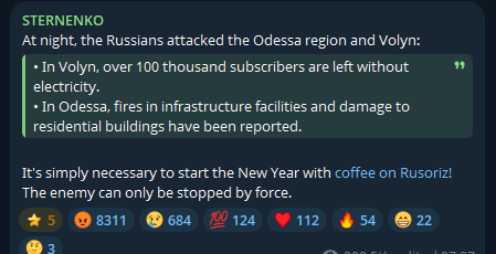 enquote:Het elektriciteitsverbruik is gedaald. Vandaag, 1 januari, om 9:30 uur, lag het verbruik 16,4% lager dan op hetzelfde tijdstip de dag ervoor - woensdag. De oorzaak van deze daling is de stroomuitval bij een aanzienlijk aantal huishoudens in de regio's Volyn en Odessa als gevolg van de Russische beschietingen, evenals de gedwongen aanscherping van de restrictieve maatregelen, vergeleken met de dag ervoor.