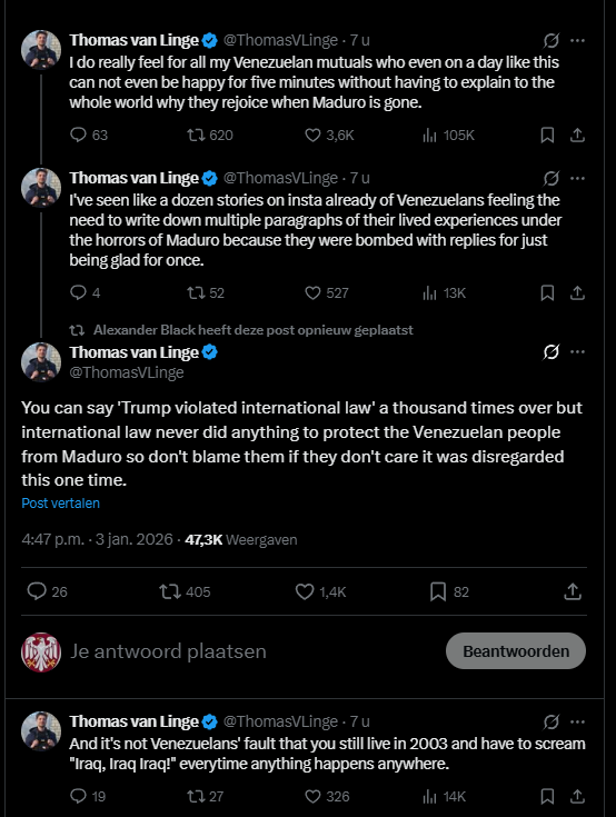 Zijn schoonvader en diens dochter laaien we ook meteen op, even de wereld hardhandig schoonpoetsen van smerige criminelen en dictators aub.quote:Op zondag 4 januari 2026 00:01 schreef Vis1980 het volgende: