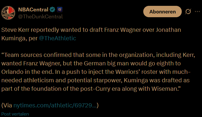 Verder wel cringe dat gewoon helemaal niemand Kuminga wil hebben. Daar zit je dan met eens speler die helemaal niet meer in San Francisco wil zijn, maar wel nog steeds een dik contract heeft. Kapitaalvernietigingsgenot.