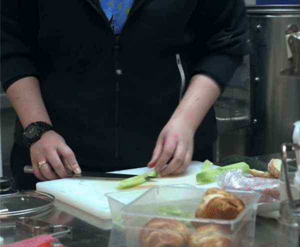 En dan staat ze een keer een komkommer te snijden, verdwijnt er meteen een deel van in haar gezicht.