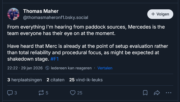 Wat ik er zo af en toe van meekrijg, is bij Mercedes alles het strakst geregeld. Een organisatie die staat als een huis. Zou me dus niks verbazen als Mercedes het goed voor elkaar heeft dit jaar, maar of dat beter is dan alle andere teams is een tweede.quote:Op vrijdag 30 januari 2026 11:31 schreef Kleffe_Dop het volgende: