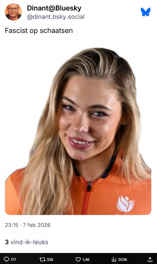 Kandidaat gemeenteraadslid voor Groenlinks in Zutphen, Dinant van den Belt, heeft een Bluesky account. En daarop is hij 'antifa', zegt hij zelf. En dus anti-Jutta Leerdam, want haar vriendje is soms weleens positief over Donald Trump, en dan is Jutta natuurlijk 'een fascist op schaatsen'. Dat kan niet anders. En dat is dan een gemeenteraadslid. Hij heeft het bericht inmiddels overigens verwijderd.De Bluesky van Dinant van den Belt, kandidaat raadslid voor GL in Zutphen