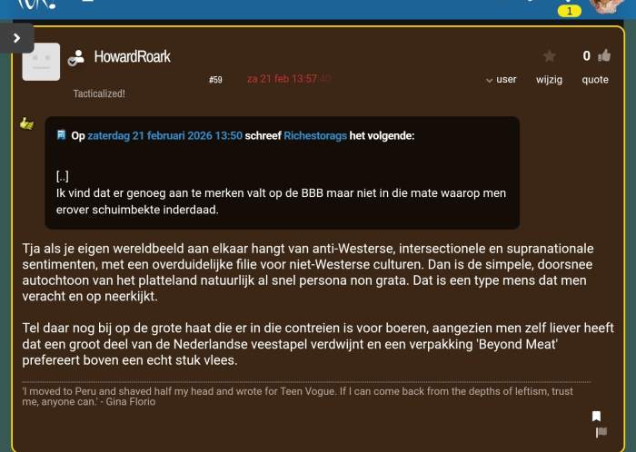 Tja als je eigen wereldbeeld aan elkaar hangt van anti-Westerse, intersectionele en supranationale sentimenten, met een overduidelijke filie voor niet-Westerse culturen. Dan is de simpele, doorsnee autochtoon van het platteland natuurlijk al snel persona non grata. Dat is een type mens dat men veracht en op neerkijkt.quote:Op zaterdag 21 februari 2026 13:50 schreef Richestorags het volgende: