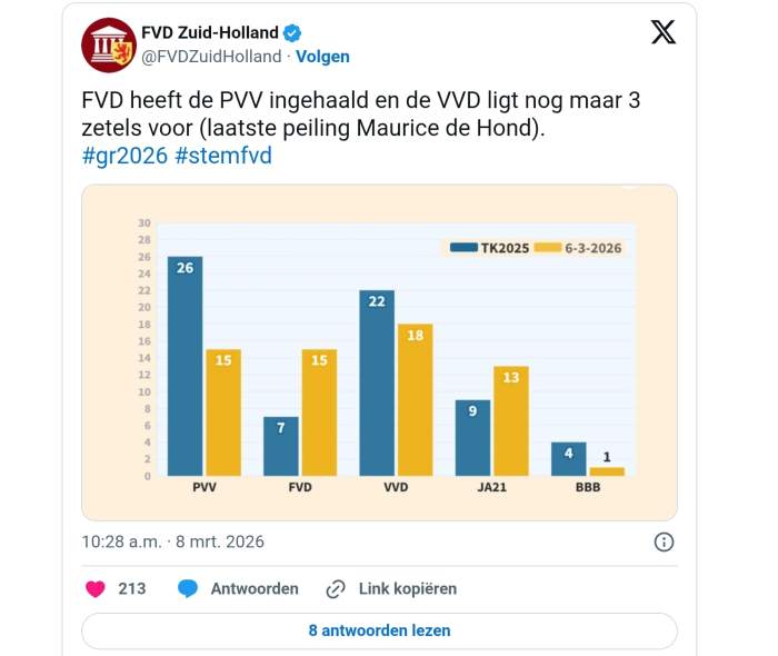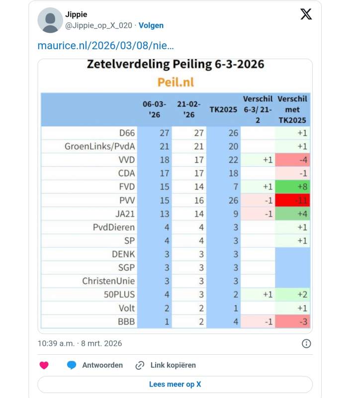Alleen de VVD die zich er weer een zeteltje bij huichelt ten koste van JA21, en dat binnen de onzekerheidsmarge.quote:Op zondag 8 maart 2026 15:54 schreef nostra het volgende: