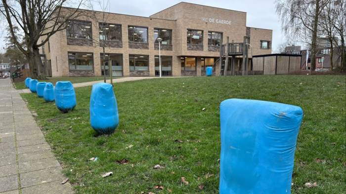 Prima om kinderen kennis te laten maken met cultuur, maar dit is wel een absurde situatie. Absurd dat er geen hek om het schoolplein staat en absurd lelijke kunst.quote:Ballen die de straat op rollen, fatbikes die kinderen omverrijden en zelfs een paar leerlingen die weglopen. Rond het plein van basisschool IKC De Gaerde in Zoetermeer is geen hek geplaatst, wat volgens veel ouders voor onveilige situaties zorgt. Er kan geen hek om het speelplein komen vanwege de aanwezige kunstwerken. Knalblauwe, omgekeerde vuilniszakken markeren de grens tussen de straat en de school. 'De gemeente vindt een paar vuilniszakken belangrijker dan de veiligheid van onze kinderen.'