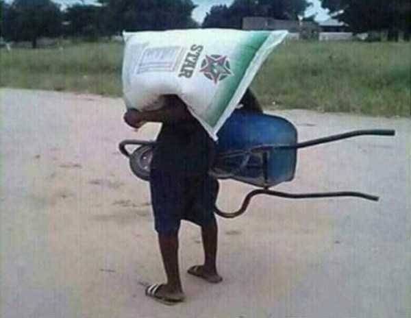 Man slaat advies van zijn vrouw in de wind want hij weet heus wel hoe een kruiwagen werkt.