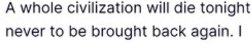 Ik weet dat je 99% van wat Trump zegt simpelweg niet serieus moet nemen, maar 'vanavond gaat een volledige beschaving dood' is toch wel reden tot reactie, lijkt me. Gewoon een volledige beschaving en samenleving dreigen uit te roeien.