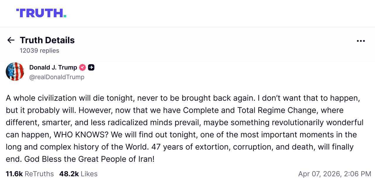 9 april 2026 — Politieke nadreun in Washington Op 9 april berichtten Amerikaanse media dat Democraten openlijker begonnen te spreken over het afzetten van Trump na zijn dreigingen tijdens de oorlog. Trumps Iran-oorlog verbreedde ook de kloof met Europese nationalisten die eerder als MAGA-bondgenoten golden. Critici in de Senaat wezen erop dat het Congres nooit formeel toestemming had gegeven voor de oorlog.