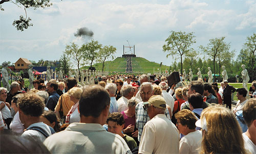 Weliswaar niet zo mooi als de voorgaande regenbogen, maar een toevalstreffer was het wel. Op de Floriade 2002 had de gasunie een openluchtvoorstelling waar eens in het uur een enorme gasflam van meters hoog een paar seconden ontvlamde. Zie ik later op een andere foto een eenzaam, vreemd, zwart wolkje aan de lucht; blijkt van die gasvlam te zijn: ![]() | |