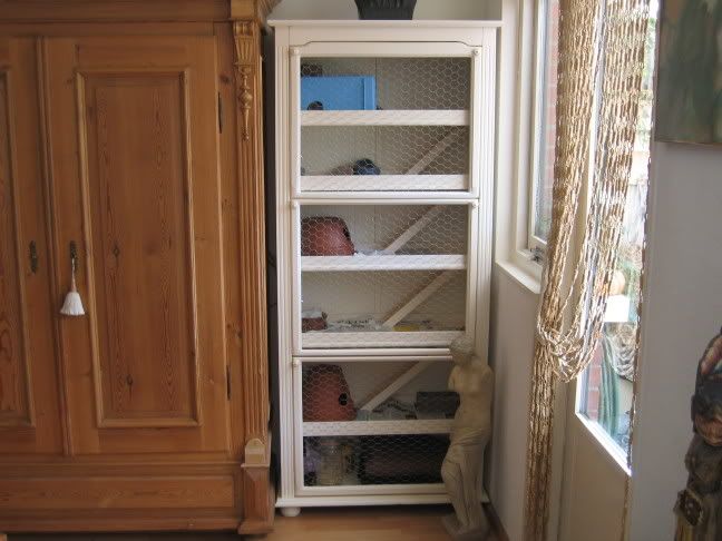 Doordat de tralies vierkant zijn, kun je echt overal van alles bevestigen zonder dat het weg glijdt. De maat was iets van .80x.80x.50. Rittens kunnen echter door de tralies heen, dus als je zo'n kooi wilt kopen, moet je daar wel rekening mee houden.