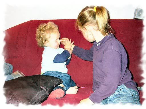 Wij hebben dus (zaten aan de overkant) de hele avond tegen de achterkanten van die dozen gekeken. Zodra ze een ander pakje hadden uitgepakt nestelden ze zich weer op de bank om lekker tegen elkaar aan verliefd naar de opmaakpop te kijken