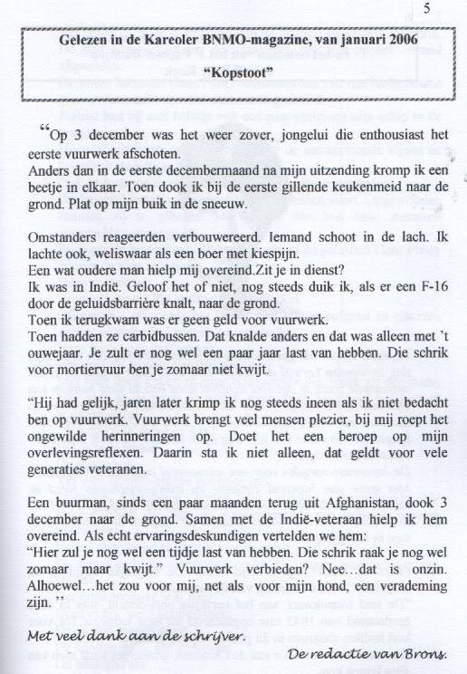 Er is een schreeuwend verschil tussen de beleidsnotities sinds 1990 en de werkelijkheid in diezelfde periode. De ondersteuning of zelfs maar de erkenning van Veteranen is allerbelabberdst. En dan is de erkenning vanuit het politieke Haagse eigenlijk nog een lichtpuntje. Defensie weet 14 jaar na het sturen van troepen naar Joegoslavië nog altijd niet wie ze nou eigenlijk hebben uitgezonden. Nog altijd wordt aan veteranen gevraagd of ze zichzelf willen aanmelden bij de organisatie die ze heeft weggestuurd.quote:Op dinsdag 14 februari 2006 19:41 schreef SCH het volgende: