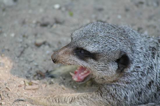 Een onscherp geeuwend stokstaartje .