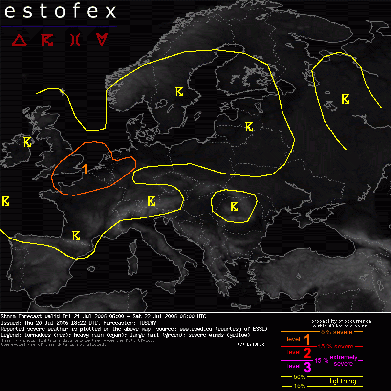 Dat zijn nog al wat onzekerheden! In ieder geval wil het in het algemeen dit zeggen:quote:Strong WAA downstream of the east-Atlantic trough and diurnal driven sea-breeze front ( moving southward from the English Channel ) should enhance / develop a baroclinic zone in the level-1 area , which should give enough forcing for storms to penetrate the cap .