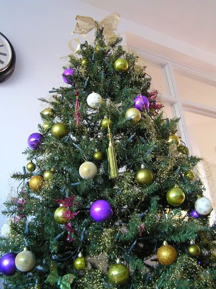 Ben om 10 uur 's ochtends begonnen, 9 uur 's avonds plofte ik moe neer op de bank. Nepboom, 56 takken en die weer tak voor tak uitgespreid, 300 lichtjes, allemaal op takken geklemd, hup ballen erin en nog wil ik er wat meer paars in gooien maar dat komt deze week nog wel.