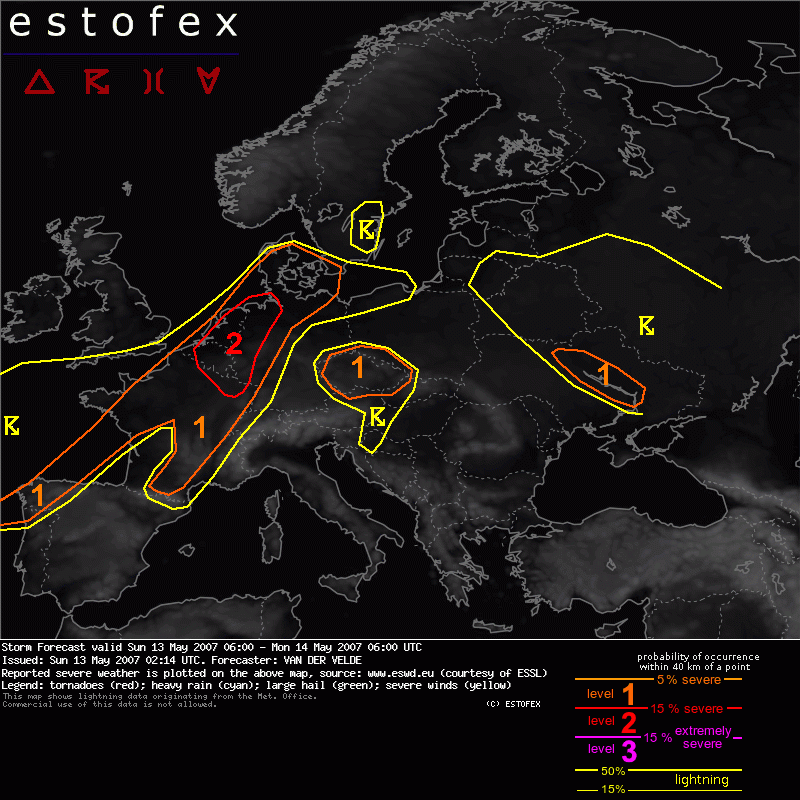| Hallo allemaal, Het zou vandaag weleens onverwacht flink kunnen spoken. Op dit moment komt het warmtefront aanzetten met wat lichte regen maar daarachter zou het dan waarschijnlijk kunnen komen tot zware onweersbuien met kans op hagel en zware windstoten. Ook is een windhoos niet uit te sluiten. Estofex(een zwaar weer organisatie) heeft code 2 uitstaan. Zij geven aan dat het in vrijwel geheel de Benelux zwaar gaat onweren. Via buienradar kun je de situatie blijven volgen. Het kan flink uitpakken maar ook flink teleurstellen. Als alles over Nederland gaat dan moet het KNMI ZEKER een waaschuwing uitzetten. Ik ben benieuwd... | |