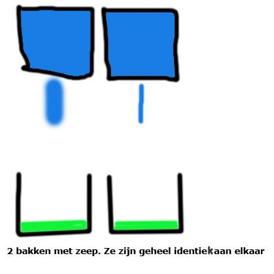 vraag 1: bakrechtsonder meer zeep omdat de waterstraal harder het water vermengt met het zeep.