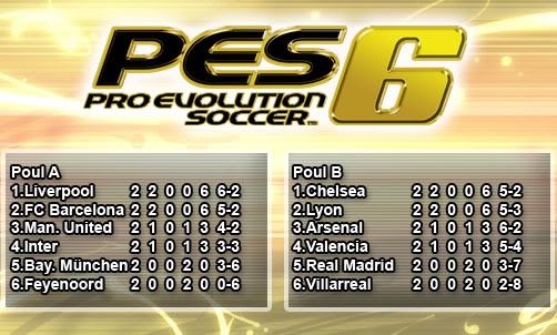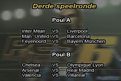 Poul A Inter - Feyenoord 3-0 omdat Feyenoord niet mee meedoet Man. Untd - Bayern Munchen 3-0 Barcelona - Liverpool 1-0 Poul B Chelsea - Villarreal 0-1 Arsenal - Valencia 3-0 Real Madrid - Lyon Beide niks van zich laten horen, beide uit het toernooi, de andere 4 zijn dus door ![]() | ||||